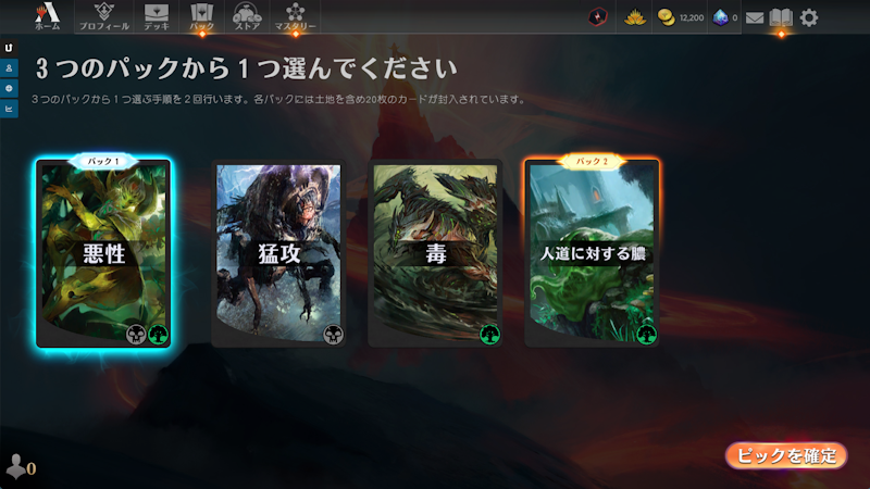 - ドラフト:8人でカードを順に取り合って、土地込みで40枚のデッキを作成して対戦します。取得したカードはすべて入手できます。3敗するまでプレイでき、勝ち数によって、追加のパックなどが得られます。AIとドラフトするクイック・ドラフトと、他のプレイヤーとドラフトするプレミア・ドラフトがあります。