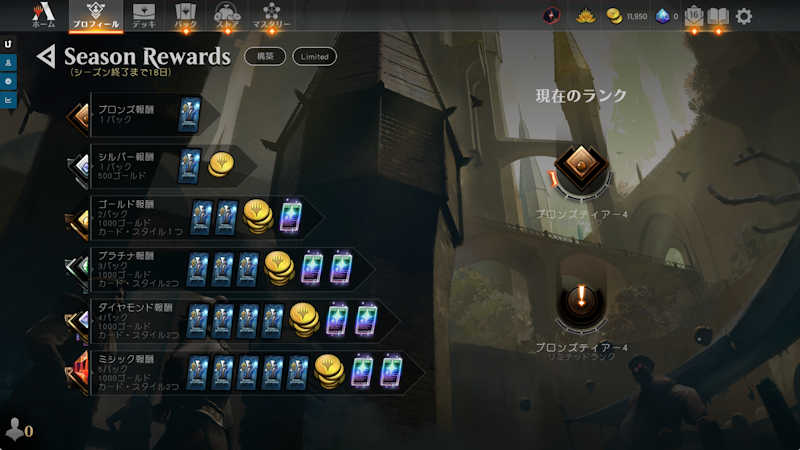 MTGアリーナのランク(構築、リミテッドの2つに分かれている)は、ブロンズ → シルバー → ゴールド → プラチナ → ダイヤ → ミシック の順で上がっていきます。