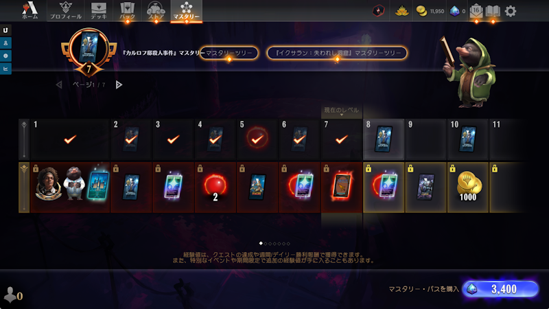 その他にもマスタリー(得た経験値で進捗していくキャラクターのレベルのようなもの)のボーナスとして得られることもありますので、実際には意外にたくさんのパックが貯まります。なお、マスタリーは上下二段になっており、下段のボーナスを得るには「マスタリー・パスを購入」する必要があります。ここでは【無課金】を目指しているのでジェムなどの購入はしません。