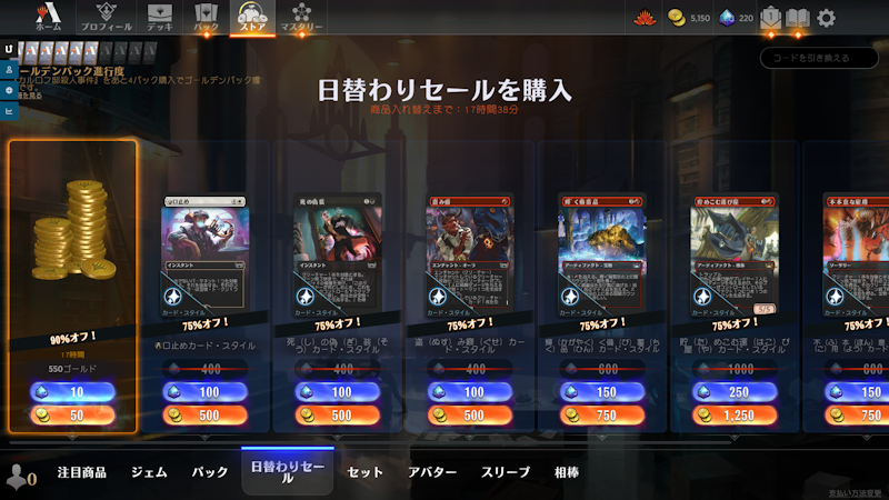 ストアの日替わりセールでは、パックが値引き販売されることがあるほか、まれに550ゴールドが90%オフの50ゴールドで販売されるという、脳がバグりそうな謎商品が出ることがあります。見かけたら迷わず買います。