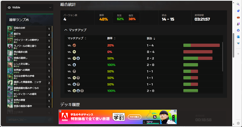 Untapped.ggで、ときどき戦歴を確認してみます。赤単と白単にまったく歯が立っていません(苦笑)やっぱりシンプルにアグロが強いです。