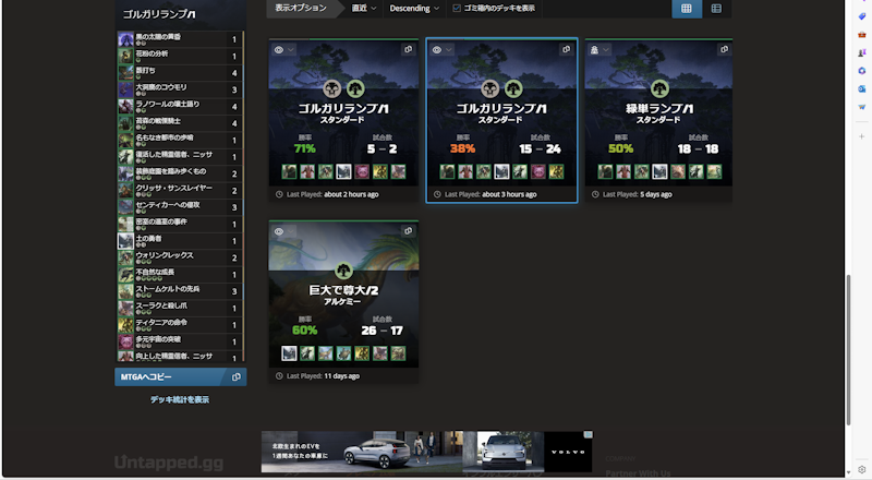 今回は、緑に黒を少し足したゴルガリをテストして、初月の残りを過ごすことにしました。なお、Untapped.ggを起動し忘れたりしたため、勝利数やデッキ名が少しおかしくなっています。