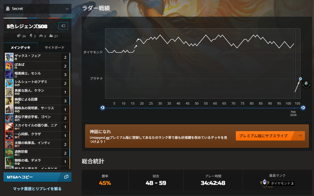 似たデッキで、勝率の高いデッキとして「人間」ではなく「同盟者」で固めたリストなどがあります。ちょっと「伝説、人間」括りは厳しいか・・・と思わなくはなかったのですが、あと一歩さえなんとかなれば感があったので、もう1ヶ月頑張ってみることにしました。