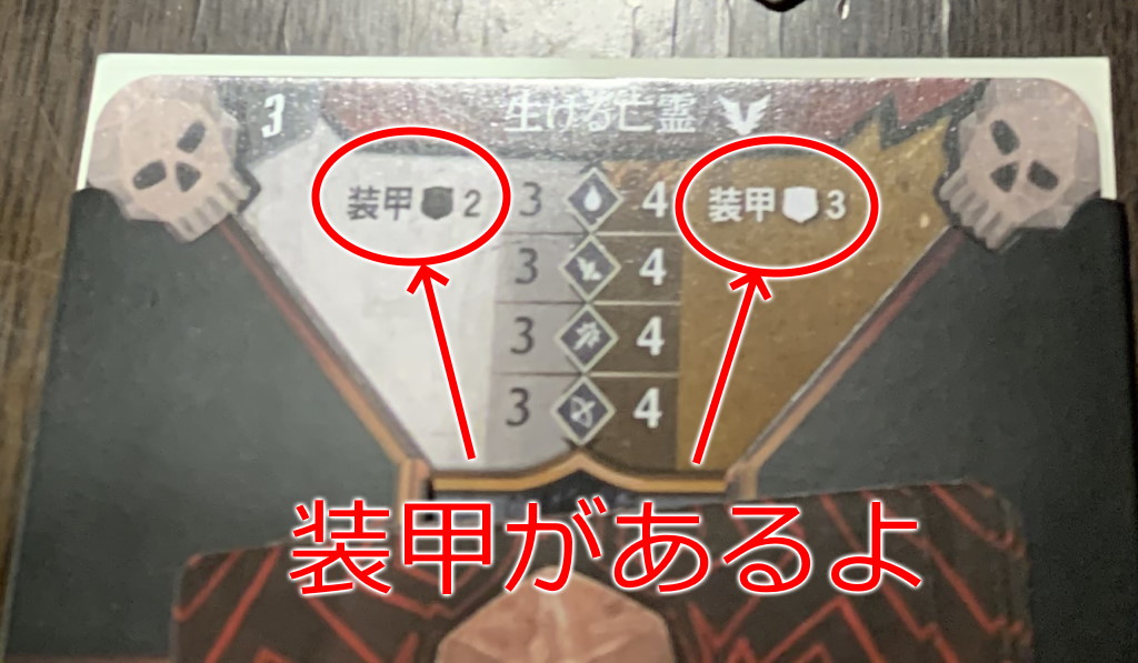 今回のシナリオには「生ける亡霊」という敵がおり、これがなかなかやっかいです。この敵は2から3という防御力を持っており、常に2~3ダメージ減らされるため、そもそも通常の攻撃ではびくともしません。体力の多い敵より、装甲がある敵の方がやっかいです。