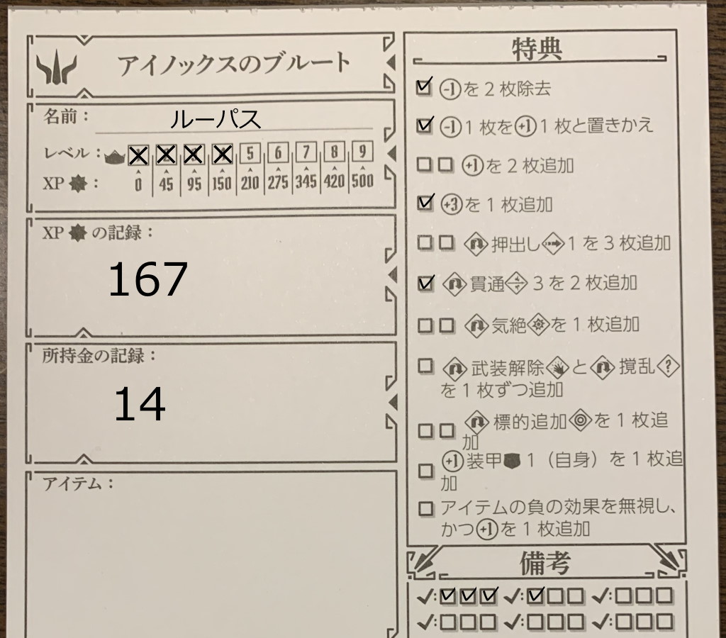 ちなみに、ルーパスのキャラクターシートはこんな感じです。右下の「備考」欄が、戦闘任務によって得た✓です。